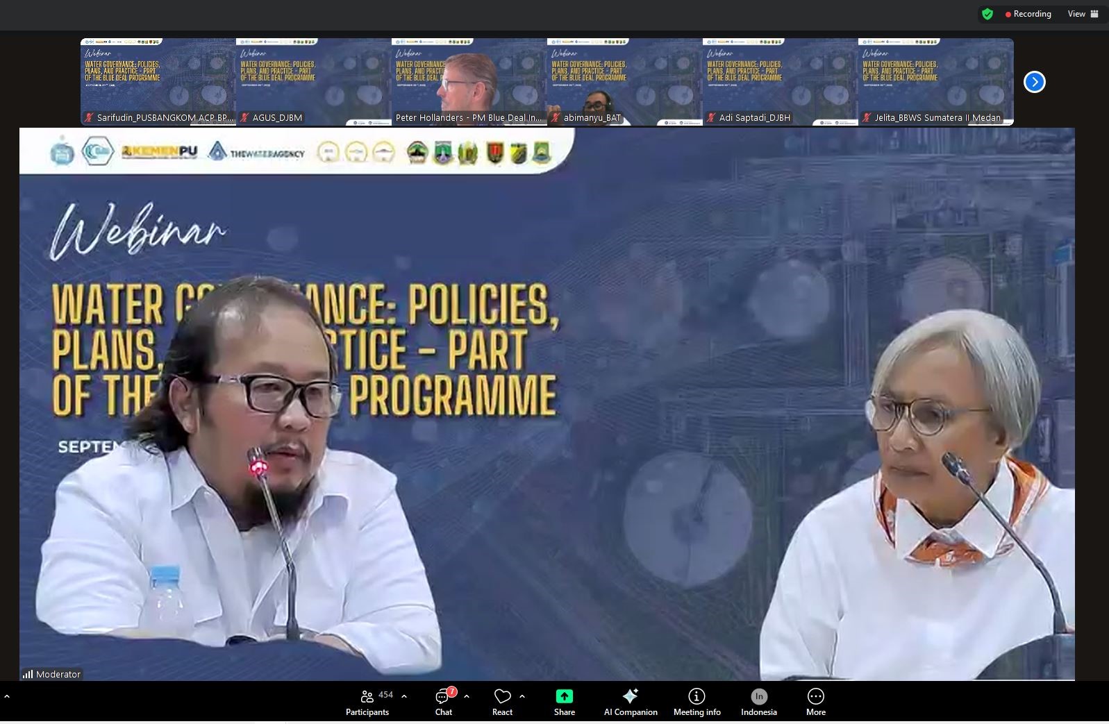 Webinar ini turut menghadirkan tiga narasumber: Andri Yosa Sabri (Kasubdit Keterpaduan Pengelolaan SDA, Kementerian PU), Sigid Hanandaja Djuga Pramana (Kasubdit Kelembagaan dan Perizinan, Kementerian PU), serta Veerie Van Loecazijn (Co-Partnership Manager Blue Deal Indonesia). Diskusi dipandu oleh praktisi SDA, Hendarti.