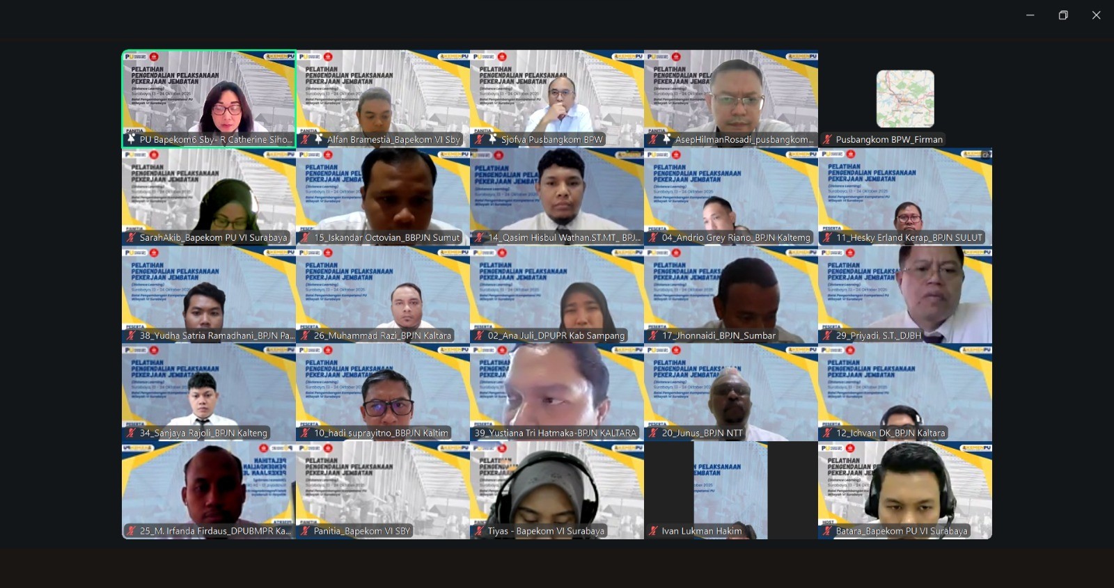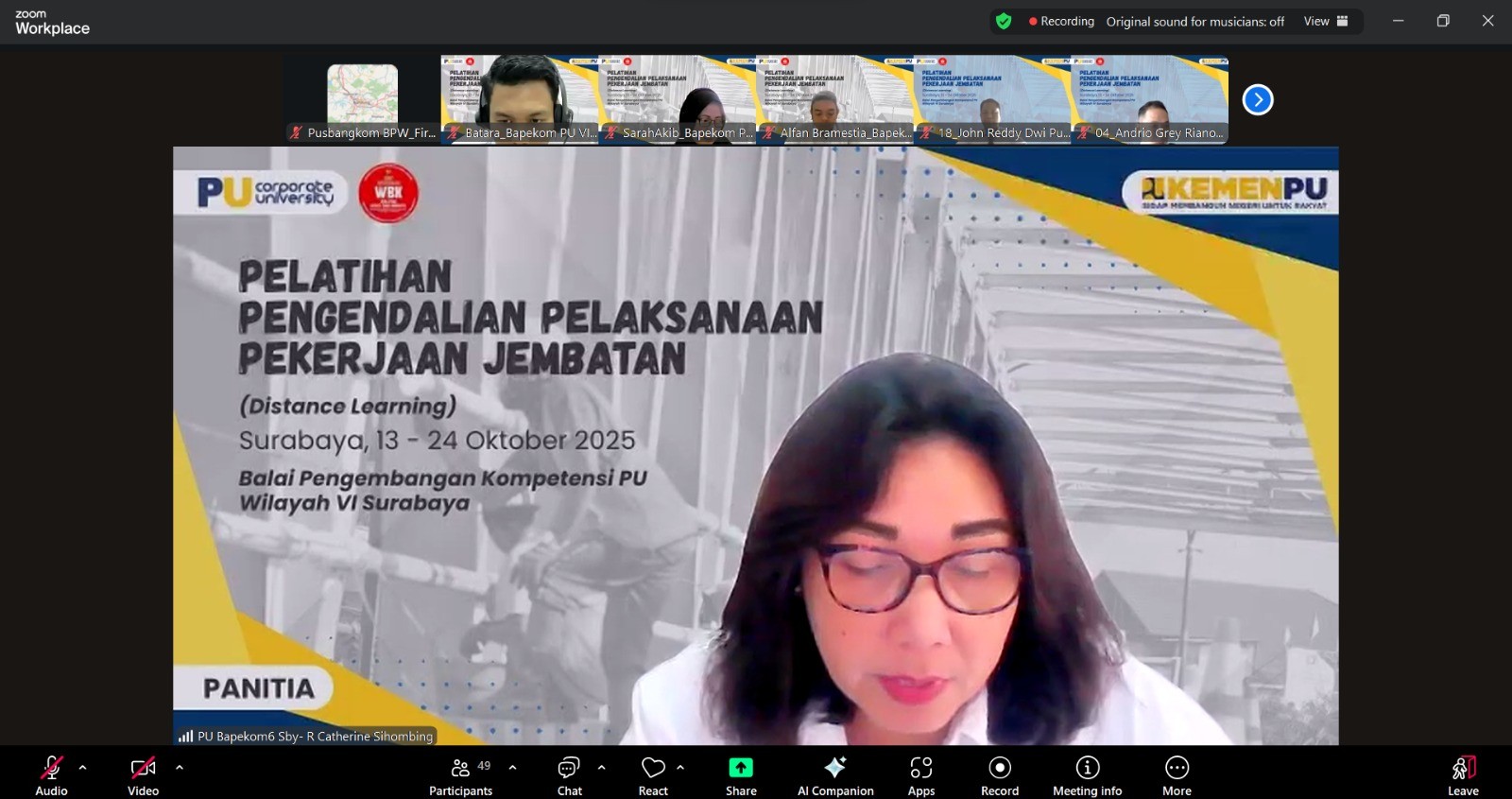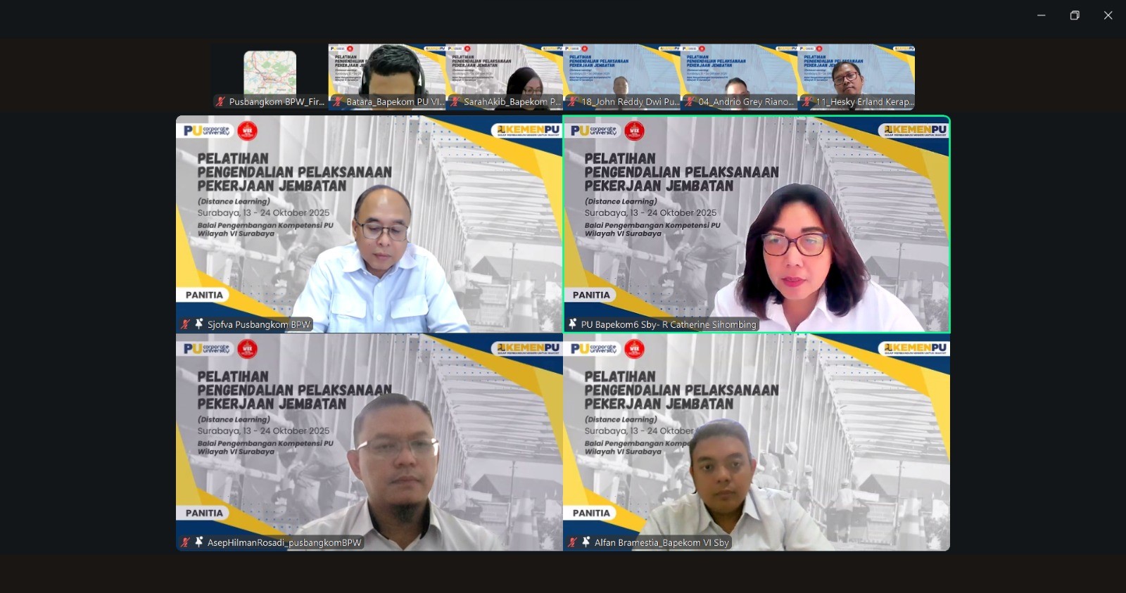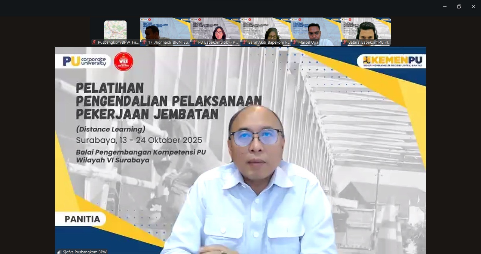 Surabaya, 13 Oktober 2025 — Badan Pengembangan Sumber Daya Manusia (BPSDM) Kementerian Pekerjaan Umum (PU) melalui Balai Pengembangan Kompetensi PU Wilayah VI Surabaya menyelenggarakan Pelatihan Pengendalian Pelaksanaan Pekerjaan Jembatan secara distance learning pada 13–24 Oktober 2025.