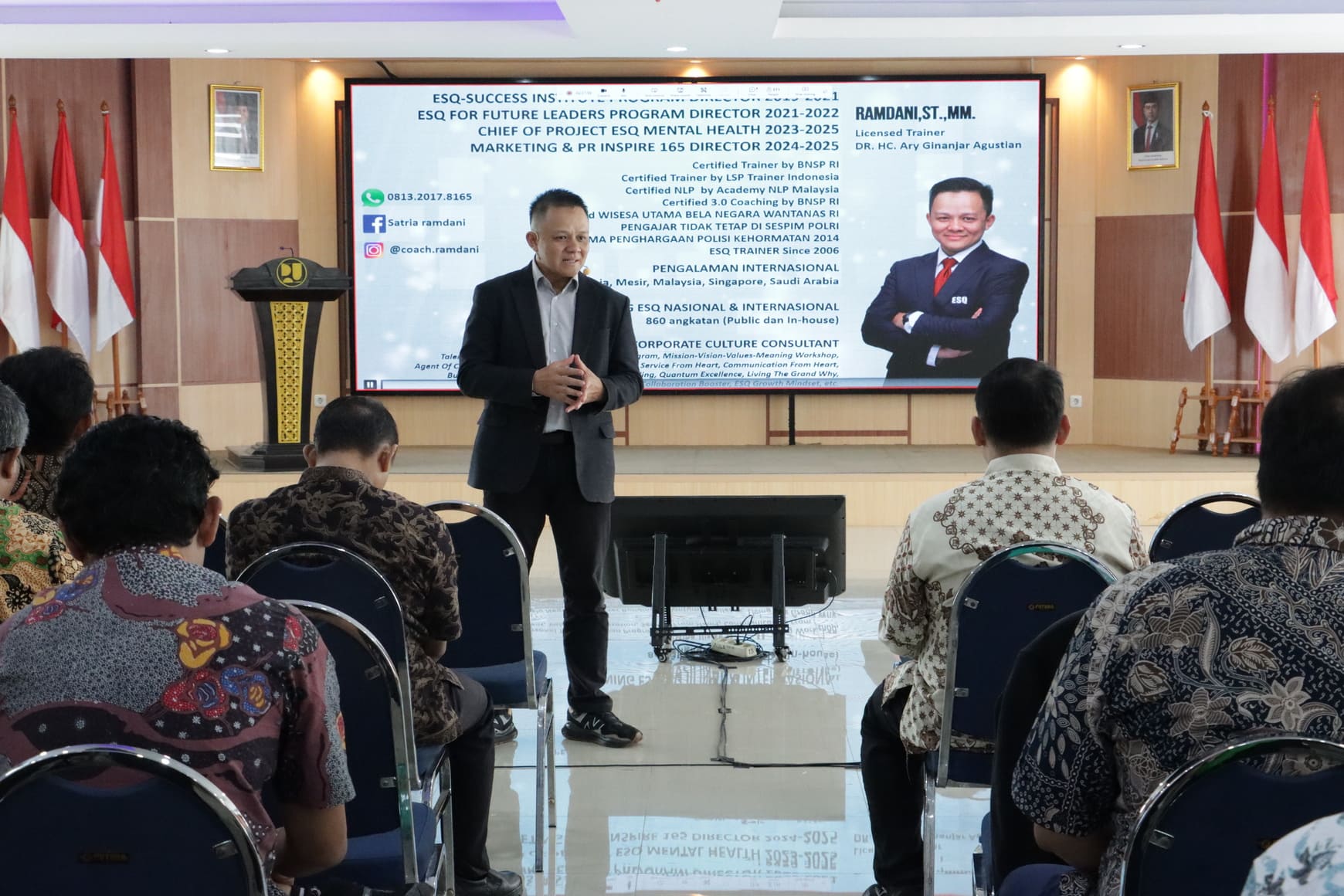 Narasumber dari ESQ, Coach Ramdani juga turut dihadirkan untuk memberikan materi mengenai Penguatan Karakter dan Etos Pengabdian ASN. Ia menekankan pentingnya membangun kualitas pelayanan publik, memperkuat integritas, serta menumbuhkan profesionalisme ASN sebagai prasyarat untuk menjawab tuntutan dan tantangan organisasi.