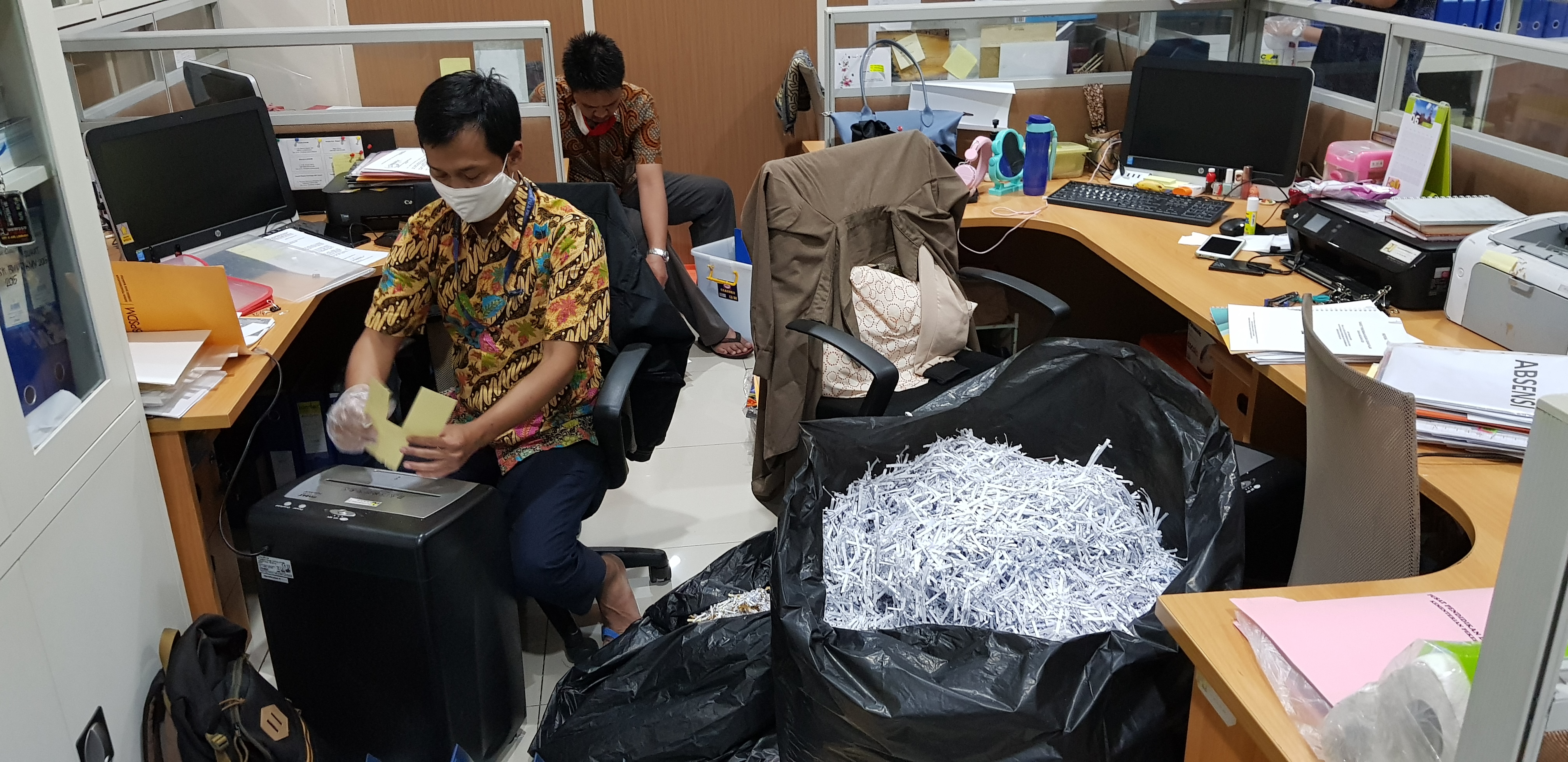 Kerja bakti kali ini difokuskan pada pembersihan sampah dan pemusnahan file yang sudah tidak terpakai serta melakukan penataan dan penyekatan ruang kerja. Hal tersebut sesuai dengan arahan Menteri PUPR atas usulan Dirjen Cipta Karya mengenai implementasi new normal di lingkungan Kementerian PUPR.