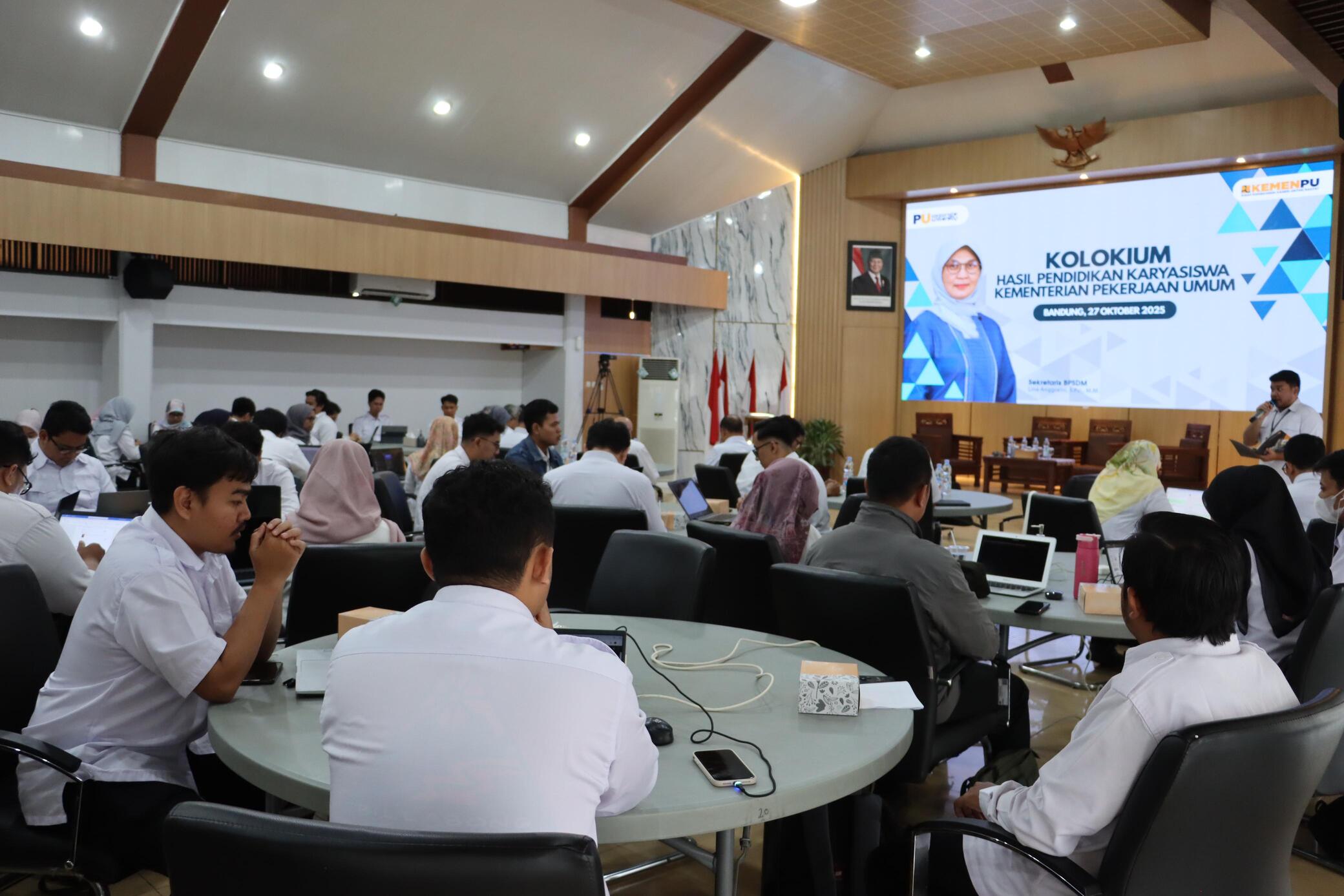 Bandung, 27 Oktober 2025 — Badan Pengembangan Sumber Daya Manusia (BPSDM) Kementerian Pekerjaan Umum (PU) menyelenggarakan Kolokium Hasil Pendidikan Karyasiswa Kementerian PU bertema “Infrastruktur Mendukung Ketahanan Pangan” pada Senin (27/10) di Balai Pengembangan Kompetensi PU Wilayah IV Bandung. Kegiatan ini dilaksanakan secara hybrid dan diikuti oleh ratusan peserta dari berbagai unit kerja di lingkungan Kementerian PU.