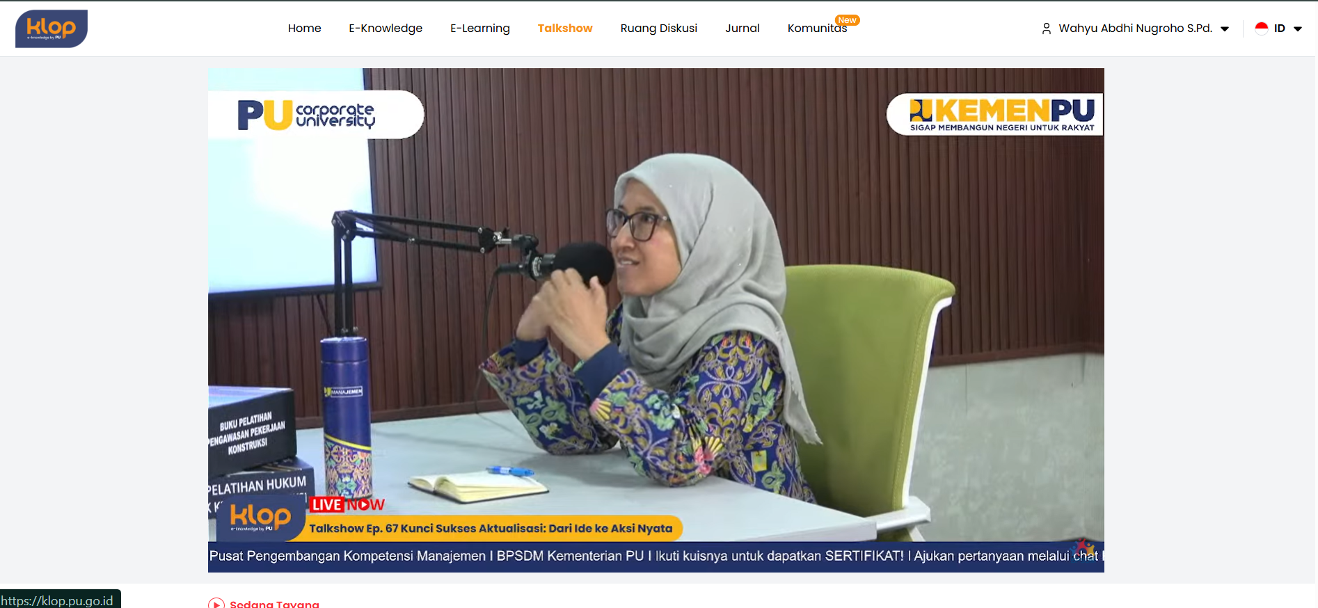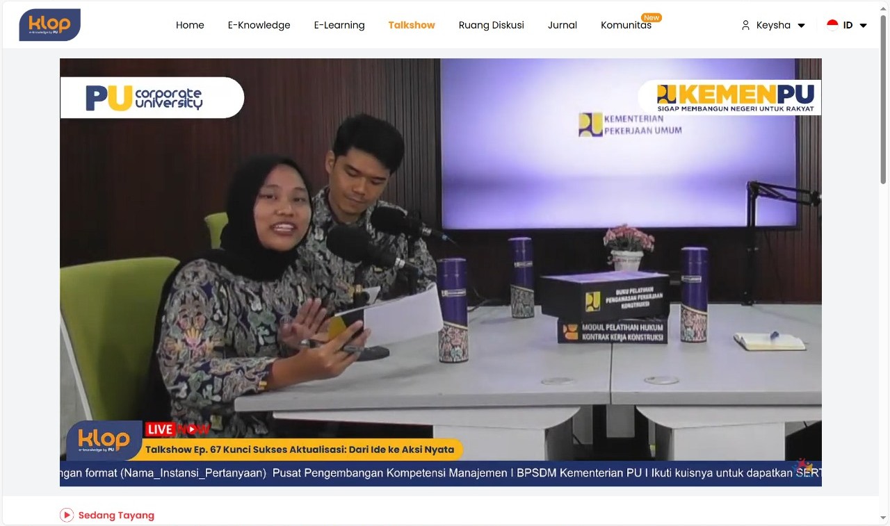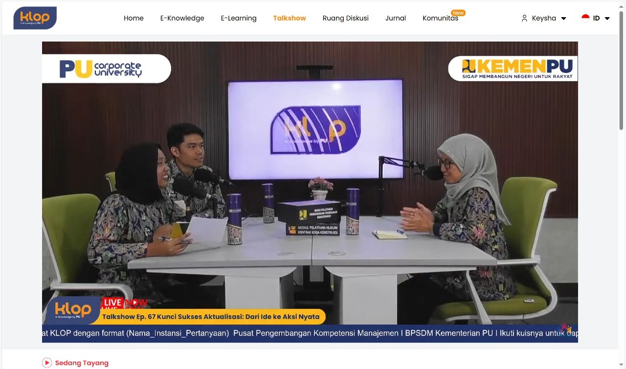 Jakarta, 8 Oktober 2025 – Badan Pengembangan Sumber Daya Manusia (BPSDM) Kementerian Pekerjaan Umum (PU) melalui Pusat Pengembangan Kompetensi Manajemen kembali menggelar KLOP Talkshow episode ke-67 bertajuk “Kunci Sukses Aktualisasi: Dari Ide ke Aksi Nyata.” Kegiatan ini menghadirkan Melly Septiani, Widyaiswara Ahli Madya dari Balai Pengembangan Kompetensi PU Wilayah III Jakarta, sebagai narasumber.