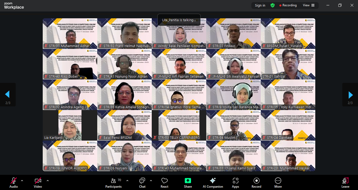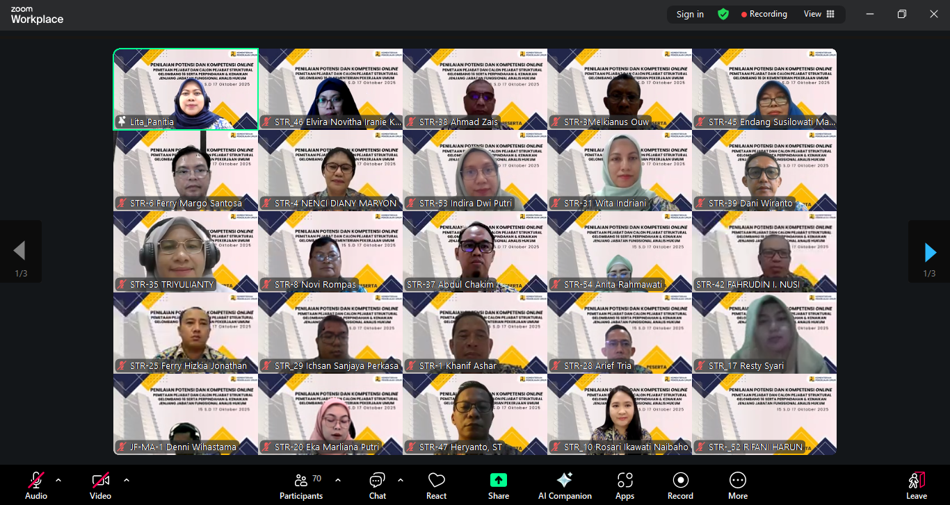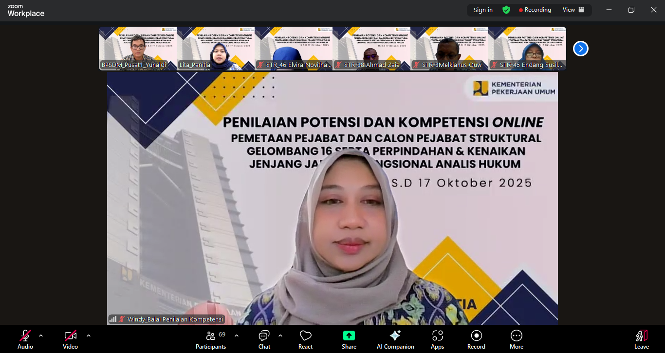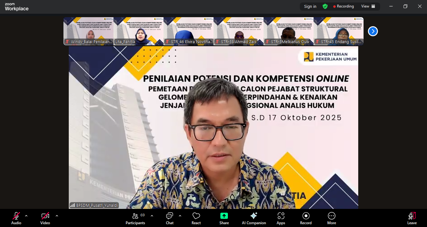 BPSDM Kementerian Pekerjaan Umum melalui Pusat Pengelolaan Talenta kembali menyelenggarakan Penilaian Potensi dan Kompetensi Online Pemetaan Pejabat dan Calon Pejabat Struktural Gelombang 16 serta Usulan Perpindahan dan Kenaikan Jenjang Jabatan Fungsional Analis Hukum di Lingkungan Kementerian Pekerjaan Umum. Kegiatan ini dilaksanakan selama 3 (tiga) hari, yaitu mulai hari ini Rabu, 15 Oktober 2025 sampai dengan Jumat, 17 Oktober 2025