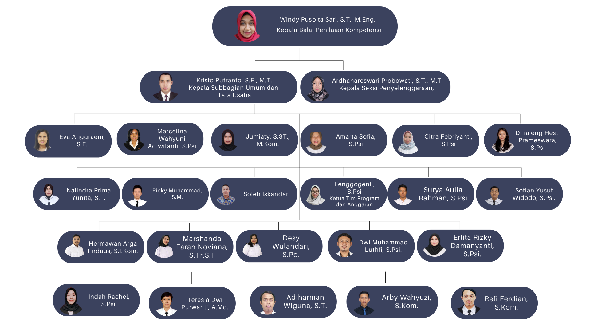Struktur organisasi Balai Penilaian Kompetensi terdiri atas Kepala Balai Penilaian Kompetensi; Kepala Subbagian Umum dan Tata Usaha; Kepala Seksi Penyelenggaraan; Kelompok Jabatan Fungsional dan Pelaksana.