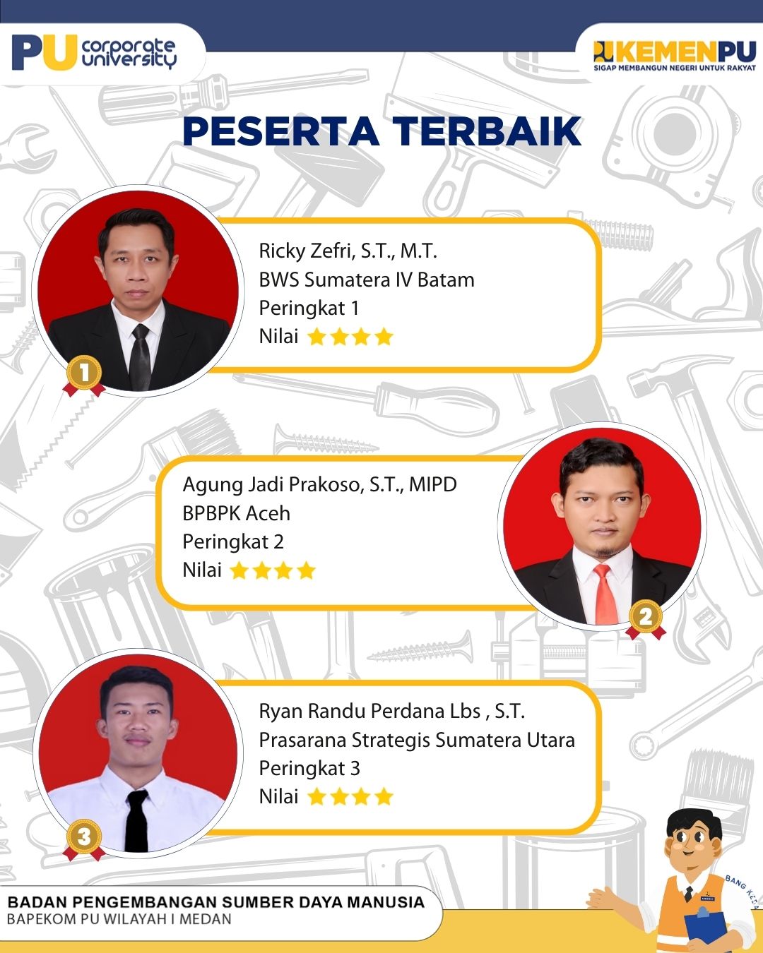 Ketiga balai yang berpartisipasi dalam kemeriahan ini adalah tuan rumah Bapekom Wilayah 1 Medan, Balai Pelaksana Pemilihan Jasa Konstruksi (BP2JK) Sumatera Utara, dan Balai Prasarana Strategis. Para pegawai dari ketiga instansi tersebut berbaur menjadi satu, menanggalkan sejenak rutinitas pekerjaan untuk berkompetisi dalam semangat persaudaraan.