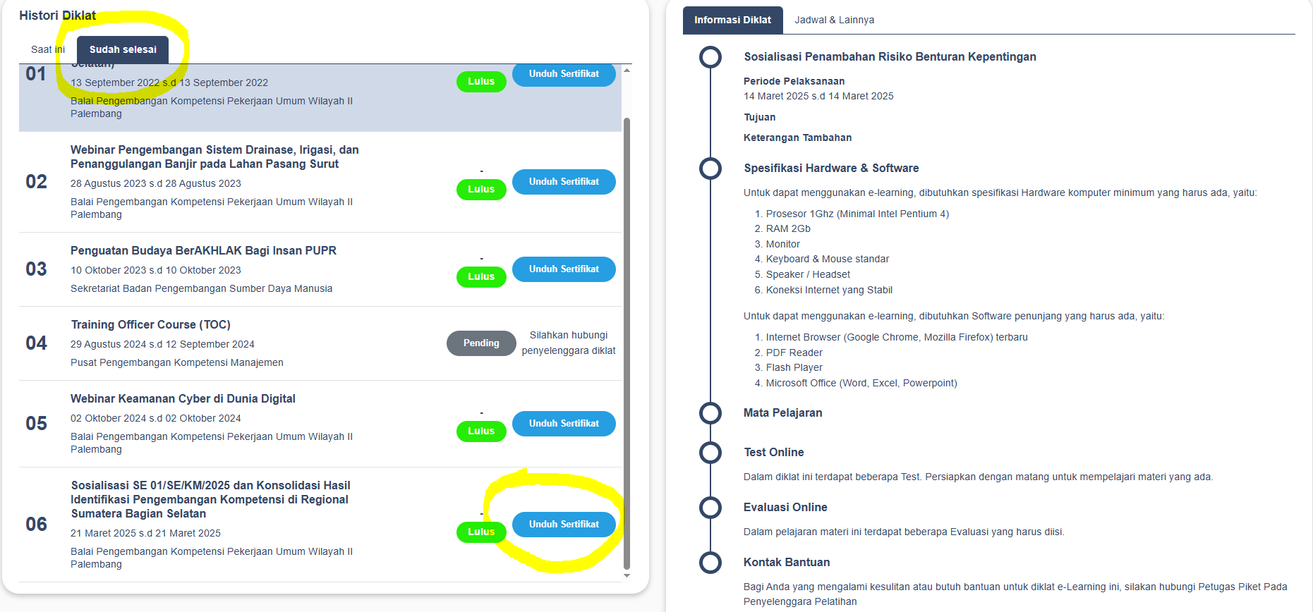 - Pilih diklat yang ingin Anda abil sertifikatnya, EX: "Sosialisasi SE 01/SE/KM/2025 dan Konsolidasi Hasil Identifikasi Pengembangan Kompetensi di Regional Sumatera Bagian Selatan" dan unduh sertifikat.