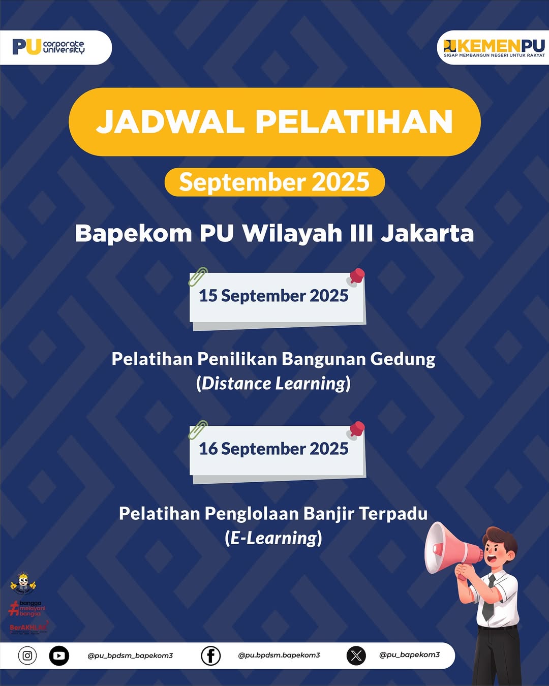 Hello #SobatBajak ! Berikut terlampir jadwal pelatihan yang terselenggara di Balai Pengembangan Kompetensi PU Wilayah 3 Jakarta pada Bulan September 2025. Bagi kalian yang ingin mengecek jadwal pelatihan lainnya dan ingin mendaftar bisa langsung kunjungi website BPSDM ya: ???? bpsdm.pu.go.id/halaman/diklat #sigapmembangunnegeriuntukrakyat #bspdmpu #pelatihanbpsdmpu2025