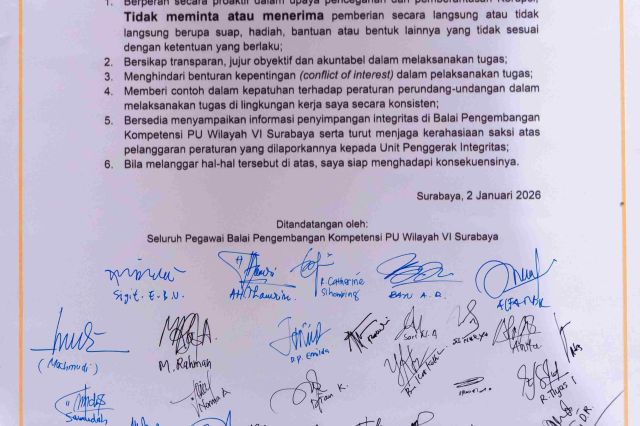 Staf Khusus Menteri PUPRSaya berterima kasih dan apresiasi pada Balai Pengembangan Kompetensi PUPR Wilayah VI Surabaya yang telah menyediakan fasilitas maupun SDM yang baik, dalam rangka menunjang berbagai pelatihan, khususnya hari ini pelatihan Prestasi, bekerja sama dengan KPK. Li Semoga Balai Pengembangan Kompetensi PUPR Wilayah VI Surabaya dapat menjaga kinerjanya dan mempertahankannya serta membuat lebih baik lagi. Selamat untuk Balai Pengembangan Kompetensi PUPR Wilayah VI Kota Surabaya.