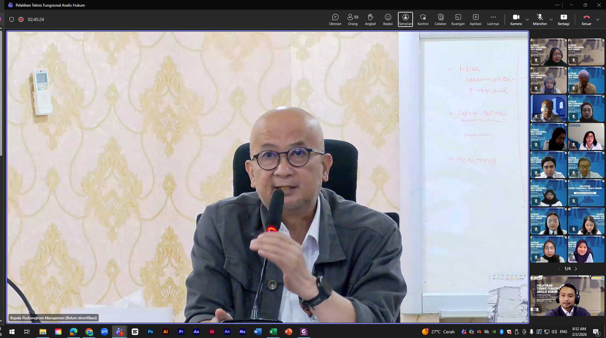 Pelatihan ini diikuti oleh Analis Hukum dari berbagai unit kerja di lingkungan Kementerian Pekerjaan Umum. Dengan total 42 Jam Pelajaran (JP), pembelajaran dikemas melalui kombinasi metode sinkron (tatap muka virtual) dan asinkron (belajar mandiri), sehingga peserta tetap dapat belajar secara fleksibel tanpa mengurangi kualitas materi dan interaksi.