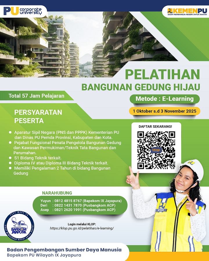 Balai Pengembangan Kompetensi Pekerjaan Umum Wilayah IX Jayapura (Bapekom PU Wilayah IX Jayapura) kembali menghadirkan program pelatihan “Bangunan Gedung Hijau”. Pelatihan ini akan dilaksanakan secara E-Learning pada 01 Oktober–03 November 2025, memanfaatkan platform digital interaktif untuk menjangkau peserta di seluruh Indonesia.